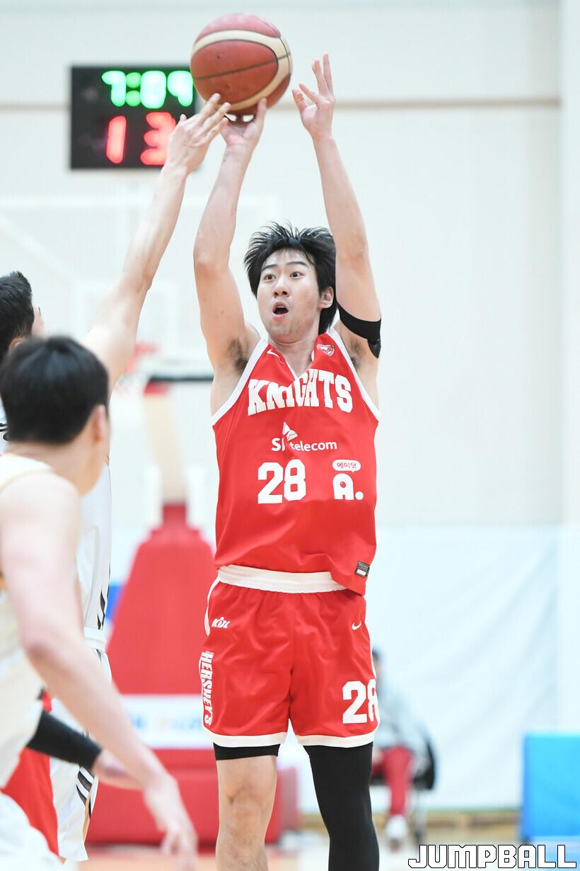 [점프볼=이천/박상혁 기자] 20일 이천 LG챔피언스파크에서 열린2024-2025 KBL D리그 SK와 상무의 경기, SK 김지후가 슛을 시도하고 있다.