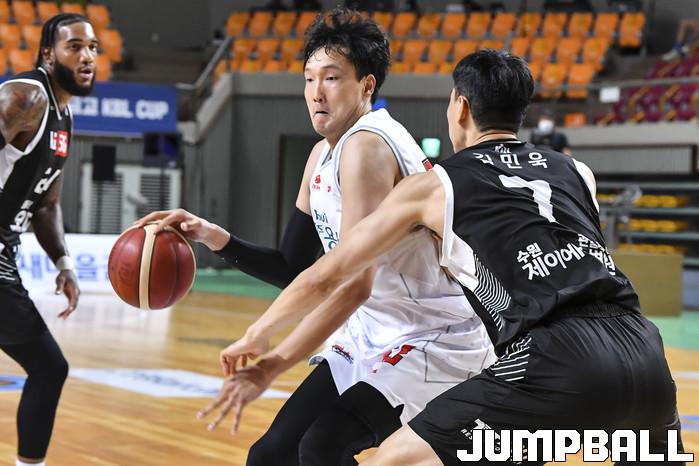 16일 경상북도 상주시 상주실내체육관에서 열린 2021 MG새마을금고 KBL컵 대회 수원 KT와 고양 오리온의 경기, 오리온 이종현이 포스트업 플레이로 골밑까지 들어가고 있다.