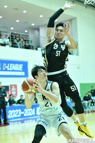 11일 이천 LG챔피언스파크에서 열린 2023-2024 KBL D-리그 DB와 LG의 경기, DB 이윤수와 LG 박정현이 경기 시작 점프볼을 다투고 있다.