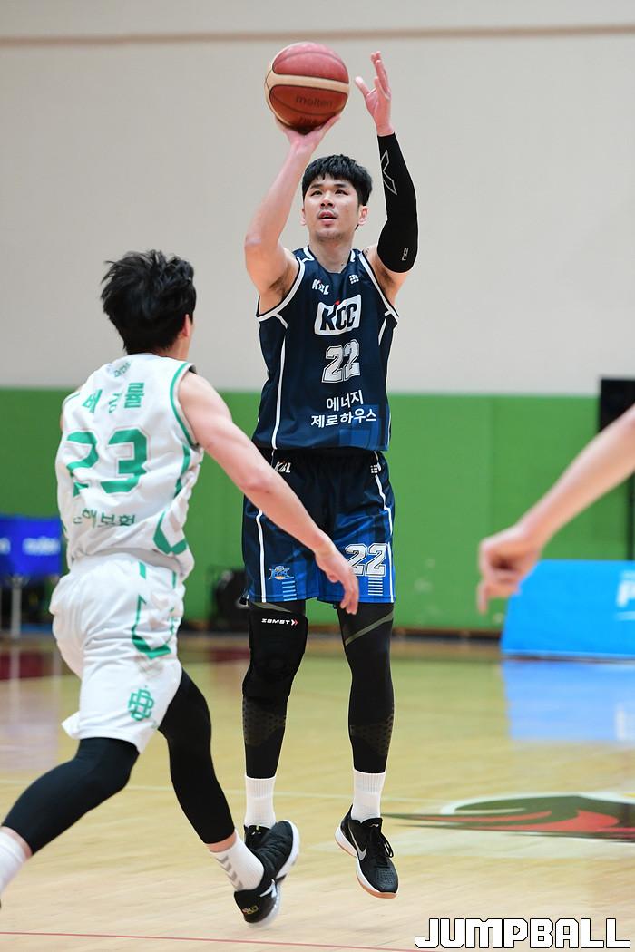 [점프볼=이천/박상혁 기자] 2일 경기도 이천에 위치한 LG챔피언스파크에서 열린 2020-2021 KBL D리그 원주 DB와 전주 KCC의 경기, KCC 김상규가 3점슛을 시도하고 있다.