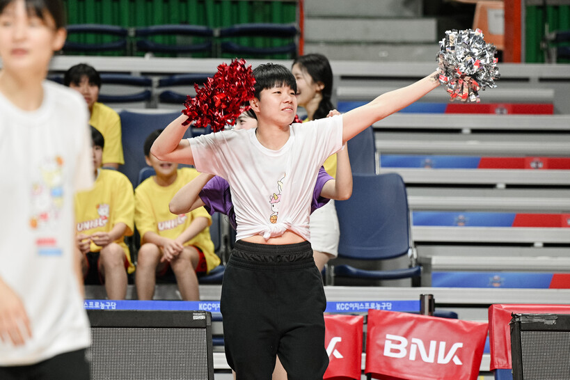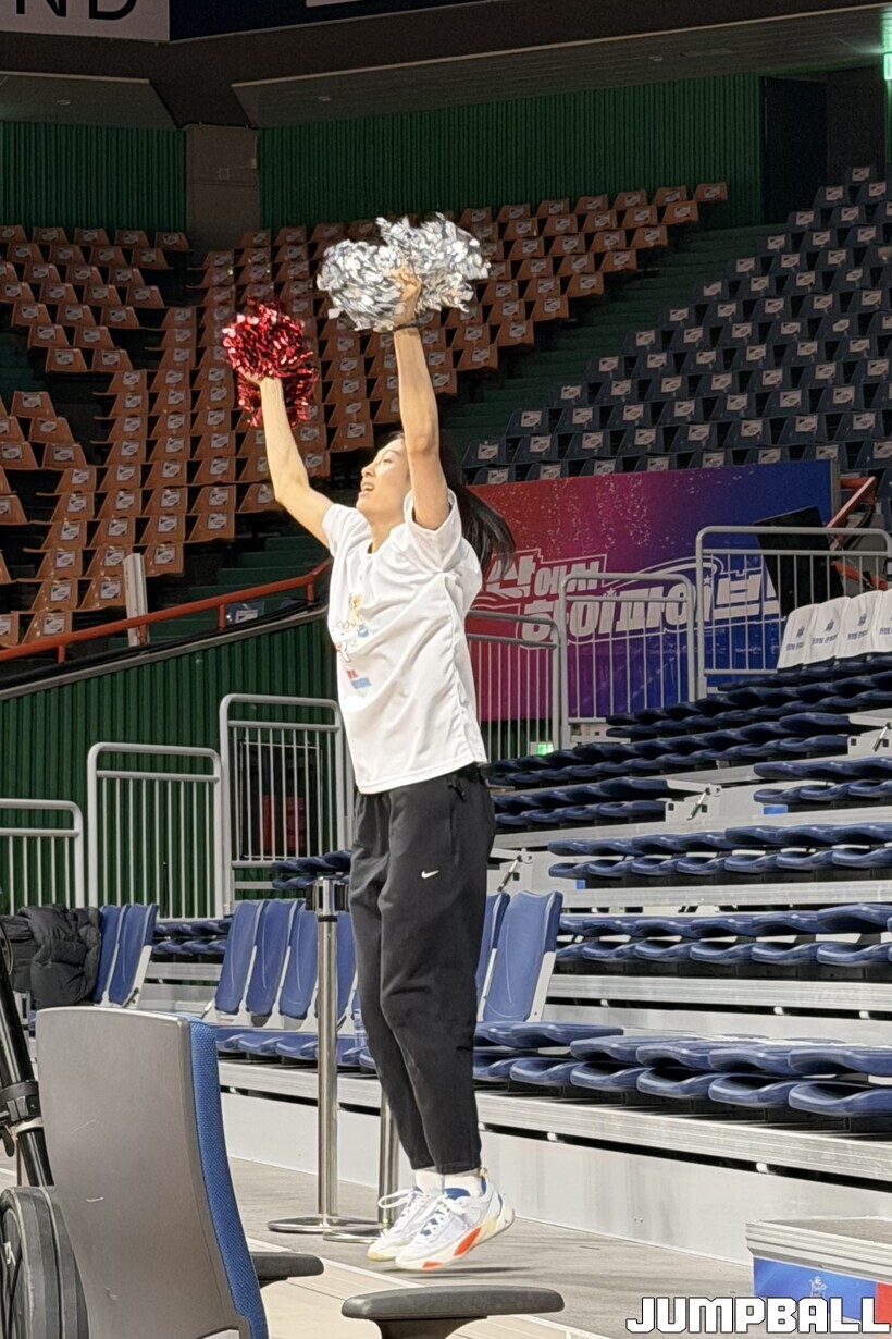 진안(하나은행)은 이해란(삼성생명)과 뜻밖의 치어리딩 대결을 펼쳤다. 응원석이 아니라 사이드라인에서 시작된 대결이었다.