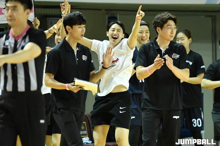 [점프볼=청주/유용우 기자] 21일 청주체육관에서 열린 '2020 우리은행 박신자컵 서머리그' 하나원큐와 삼성생명의 결승전, 하나원큐 강이슬이 후배들의 플레이에 벤치에서 환호하고 있다.