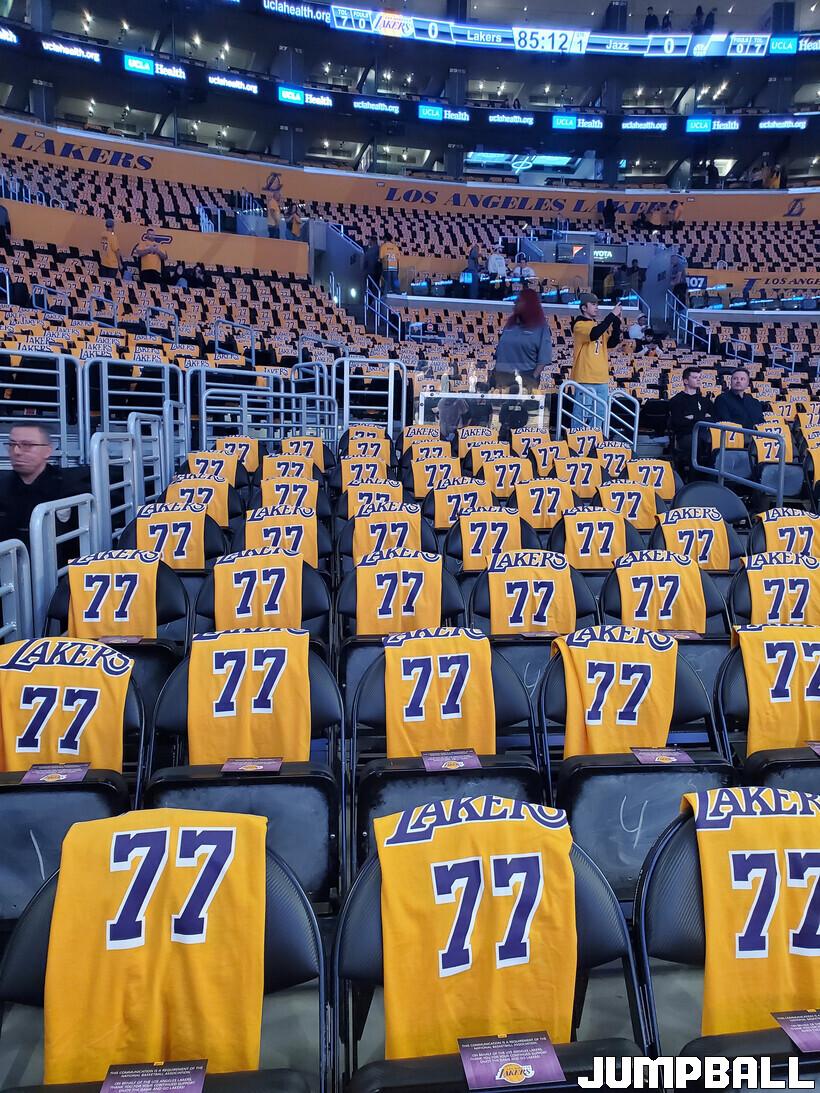 경기장은 온통 황금색에 "77번"으로 도배되어 있었는데, 입장 관중을 위한 증정품으로 루카 돈치치의 레이커스 티셔츠를 마련한 것이었다.