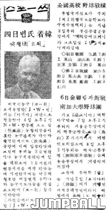 | ▲존 번의 내한 사실을 보도한 1955년 8월 6일자 경향신문 8면 기사 |