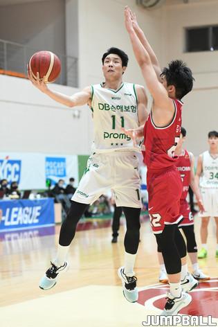 13일 경기도 이천에 위치한 LG챔피언스파크에서 열린 2021-2022 KBL D리그 원주 DB와 창원 LG의 경기, LG 박정현이 훅슛을 시도하고 있다.