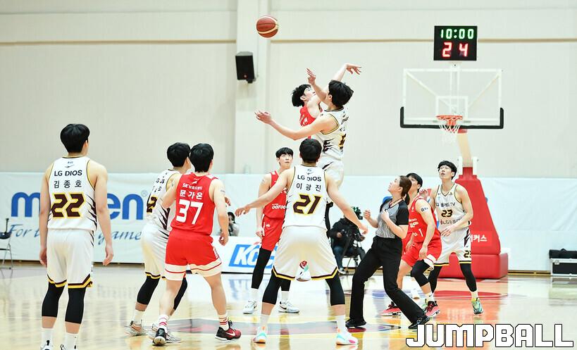 20일 이천 LG챔피언스파크에서 열린 2022-2023 KBL D-LEAGUE SK와 LG의 경기, SK 임현택과 LG 박인태가 경기시작 점프볼을 다투고 있다.
