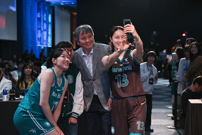 하나은행의 김정은은 “그대로 감독님을 위해서 간단하게 준비했다”며 웃었다. 그의 말대로 이상범 감독은 서서 양손 주먹을 쥐는 간단한 포즈로 포토타임을 가졌다.