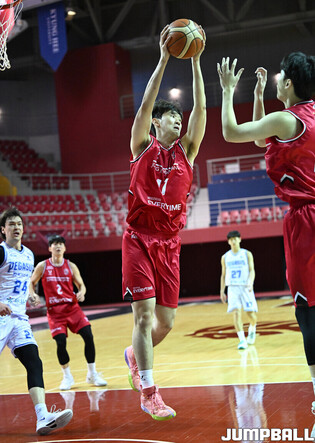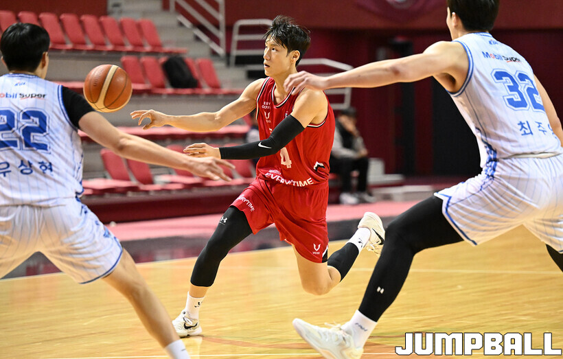 [점프볼=용인/문복주 기자] 3일 경희대 국제캠퍼스 선승관에서 열린 2025-2026 KBL D리그 안양 정관장과 대구 한국가스공사의 경기에서 정관장 박정웅이 사이드로 패스를 하고 있다.