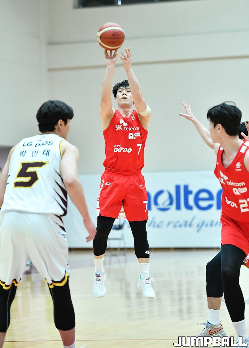 20일 이천 LG챔피언스파크에서 열린 2022-2023 KBL D-LEAGUE SK와 LG의 경기, SK 홍경기가 여유있게 3점슛을 시도하고 있다.