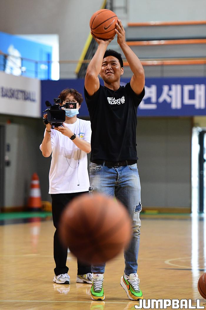 [점프볼=서울/박상혁 기자] 6일 연세대 신촌캠퍼스 체육관에서 대한체육회 주최로 '라이벌 대전' 첫회 녹화가 진행되었다. 연세대는 김택훈이 감독으로 나와 신승민과 양준석, 유기상과 팀을 이루었고, 고려대는 이현호가 감독으로 출전하여 여준형, 최성현, 김태완을 지도했다. 고려대 이현호 감독이 3점슛 대결에서 슛을 던지고 있다.