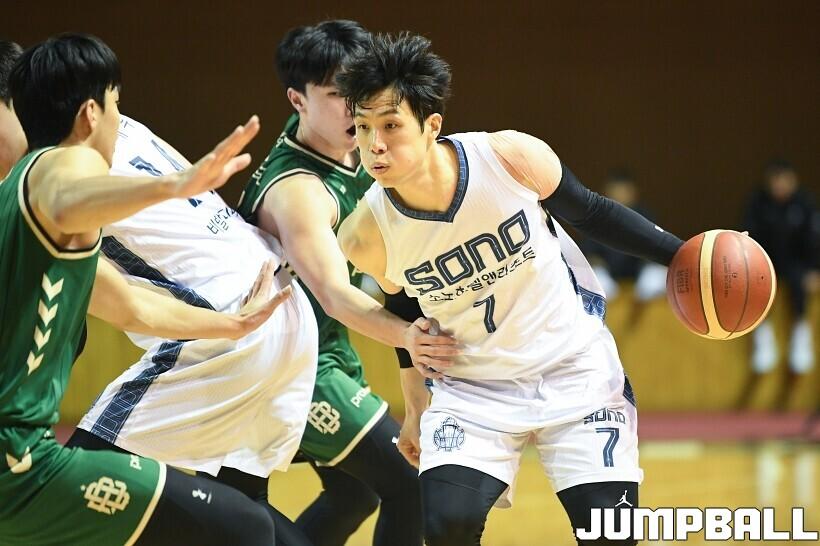 [점프볼=용인/유용우 기자] 23일 경희대 국제캠퍼스 선승관에서 열린 2025-2026 KBL D리그 울산 현대모비스와 원주 DB의 경기, 소노 홍경기가 수비를 돌파하며 공격하고 있다.