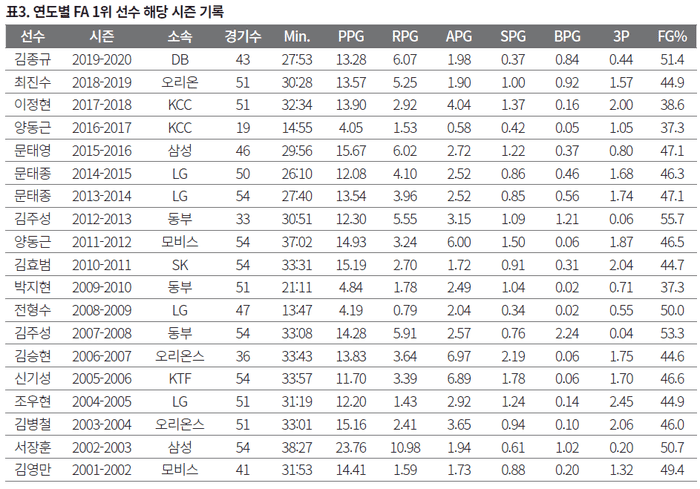 1997시즌부터 출발한 KBL은 5시즌을 치른 2001년 처음으로 FA 시장을 열었다. 이로부터 올해까지 20년이 지났다. 지난 20년 동안 736명(2012년 문태영, 이승준, 전태풍은 공식적으로 FA가 아니지만 첫 번째 계약기간이 만료되어 FA로 반영)이 FA 자격을 얻었고, 462명이 계약했다.