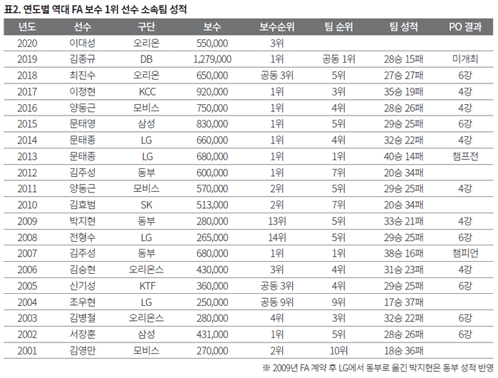 FA 보수 1위 소속팀의 성적