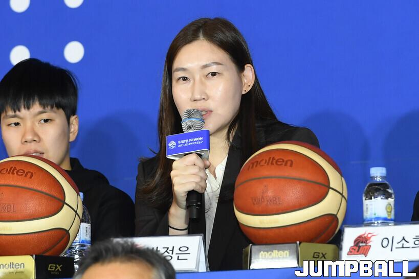 [점프볼=청담/박상혁 기자] 30일 청담 리베라호텔 베르사이유홀에서 열린 우리은행 우리WON 2023-2024 여자프로농구 개막미디어데이, BNK썸 박정은 감독이 출사표를 얘기하고 있다.