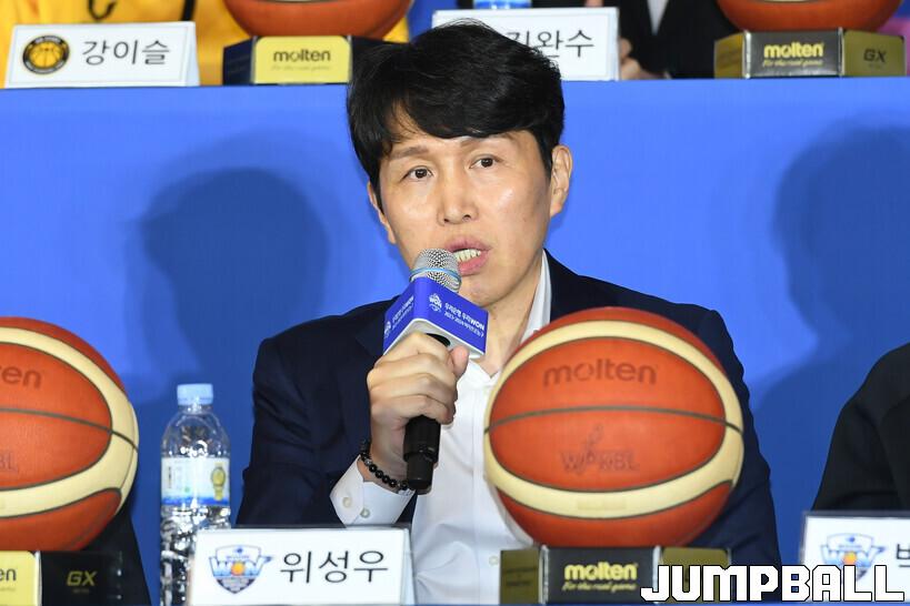 [점프볼=청담/박상혁 기자] 30일 청담 리베라호텔 베르사이유홀에서 열린 우리은행 우리WON 2023-2024 여자프로농구 개막미디어데이, 우리은행 위성우 감독이 출사표를 얘기하고 있다.