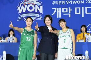 [점프볼=청담/박상혁 기자] 30일 청담 리베라호텔 베르사이유홀에서 열린 우리은행 우리WON 2023-2024 여자프로농구 개막미디어데이, 신한은행 구나단 감독이 출사표를 던지고 있다.
