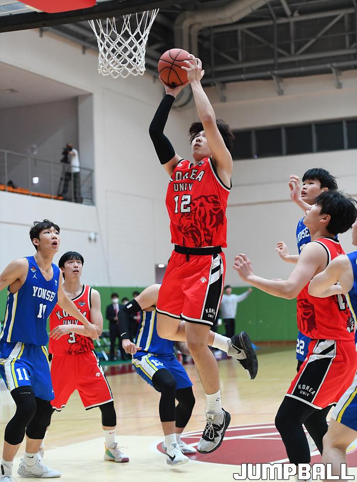 [점프볼=이천/문복주기자] 18일 경기도 이천 LG챔피언스파크에서 열린 2020 KUSF 대학농구 U-리그 남대부 결승전으로 고려대와 연세대의 경기, 고려대 문정현이 공격리바운드로 득점하고 있다.