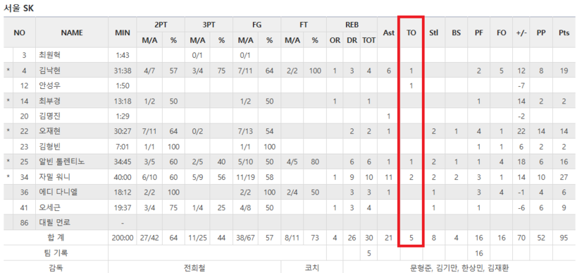 종료 후 SK의 실책은 5개에 불과했다. 올 시즌 SK 최소 실책 3위(1위는 1월 11일 삼성전 3개) 경기였다. 95-81로 완승, 4위(20승 14패)를 유지했다.