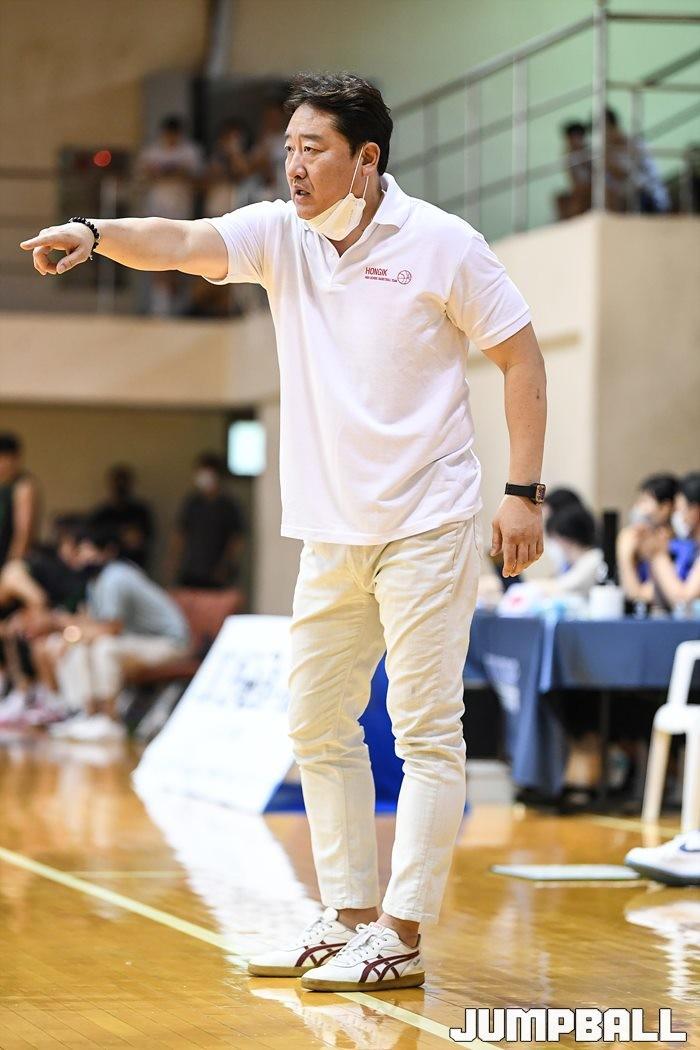 3일 양천구에 위치한 양정고등학교 체육관에서 열린 2022 한국중고농구 주말리그 홍익사대부고와 강원사대부고의 경기, 홍익사대부고 이무진 코치가 작전을 지시하고 있다.  [점프볼=유용우 기자]