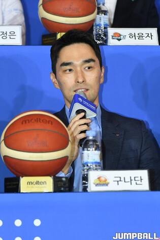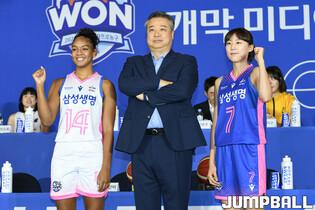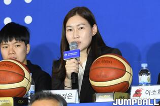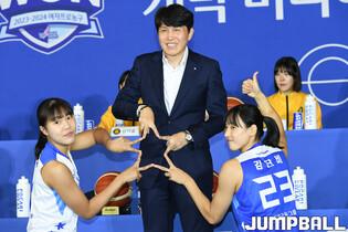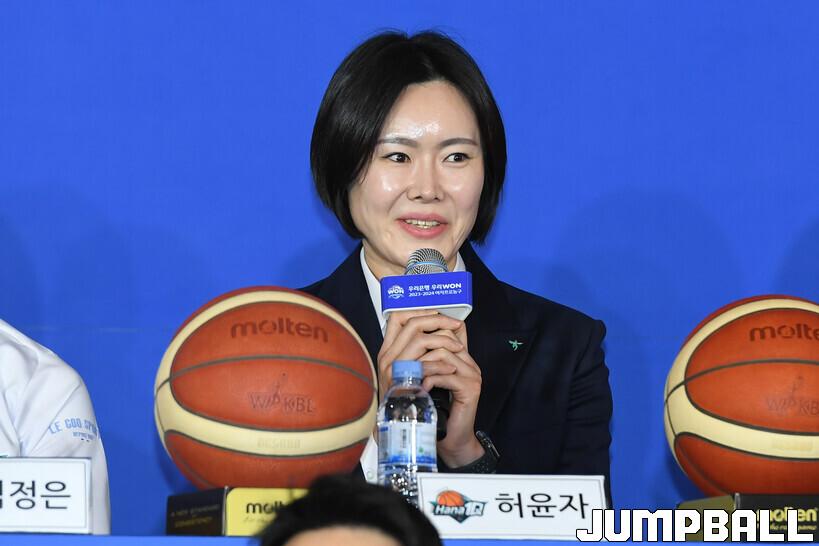 [점프볼=청담/박상혁 기자] 30일 청담 리베라호텔 베르사이유홀에서 열린 우리은행 우리WON 2023-2024 여자프로농구 개막미디어데이, 하나원큐 허윤자 코치가 출사표를 던지고 있다.