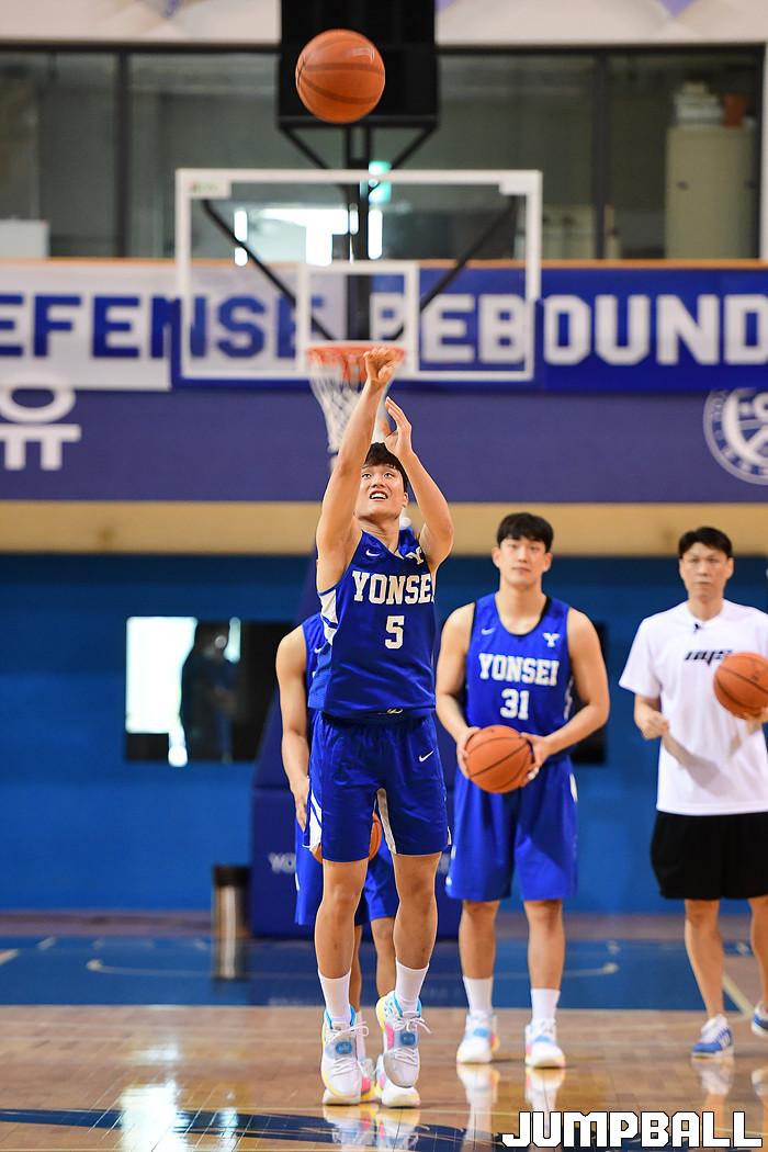 [점프볼=서울/박상혁 기자] 6일 연세대 신촌캠퍼스 체육관에서 대한체육회 주최로 '라이벌 대전' 첫회 녹화가 진행되었다. 연세대는 김택훈이 감독으로 나와 신승민과 양준석, 유기상과 팀을 이루었고, 고려대는 이현호가 감독으로 출전하여 여준형, 최성현, 김태완을 지도했다. 하프라인 슛 대결에서 연세대 양준석 슛을 시도하고 있다.