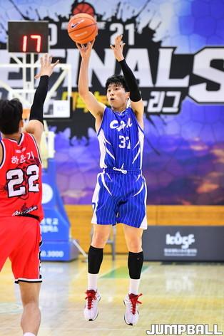 2일 충주 건국대학교 글로컬캠퍼스 건국체육관에서 열린 2021 KUSF 대학농구 U리그 플레이오프 단국대와 성균관대의 경기. 성균관대 송동훈이 페이더웨이 슛을 던지고 있다.