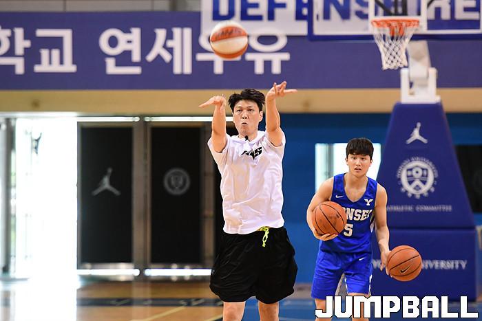 [점프볼=서울/박상혁 기자] 6일 연세대 신촌캠퍼스 체육관에서 대한체육회 주최로 '라이벌 대전' 첫회 녹화가 진행되었다. 연세대는 김택훈이 감독으로 나와 신승민과 양준석, 유기상과 팀을 이루었고, 고려대는 이현호가 감독으로 출전하여 여준형, 최성현, 김태완을 지도했다. 하프라인 슛 대결에서 연세대 김택훈 감독이 슛을 시도하고 있다.