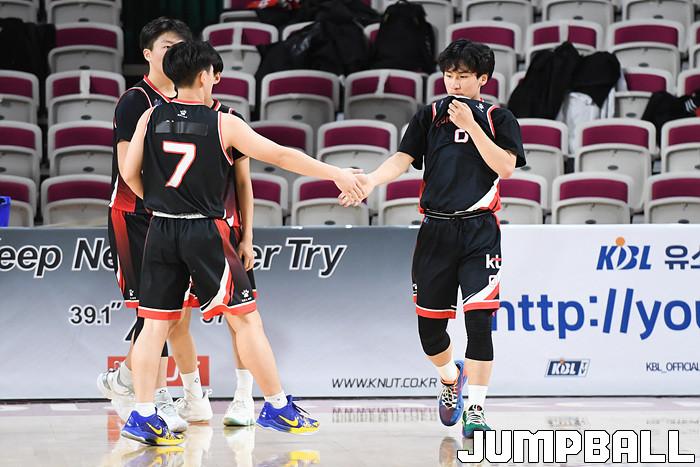 [점프볼=창원/박상혁 기자] 6일 창원실내체육관에서 열린 2020-2021 KBL 유소년 주말리그 C권역 U15 KT와 현대모비스의 경기, KT 선수들이 하이파이브를 하고 있다.