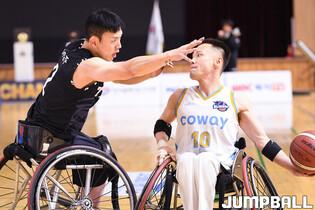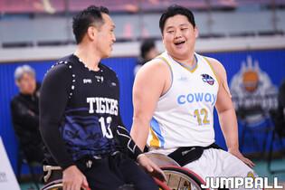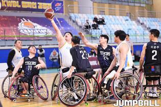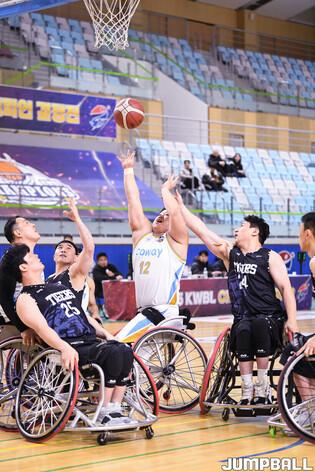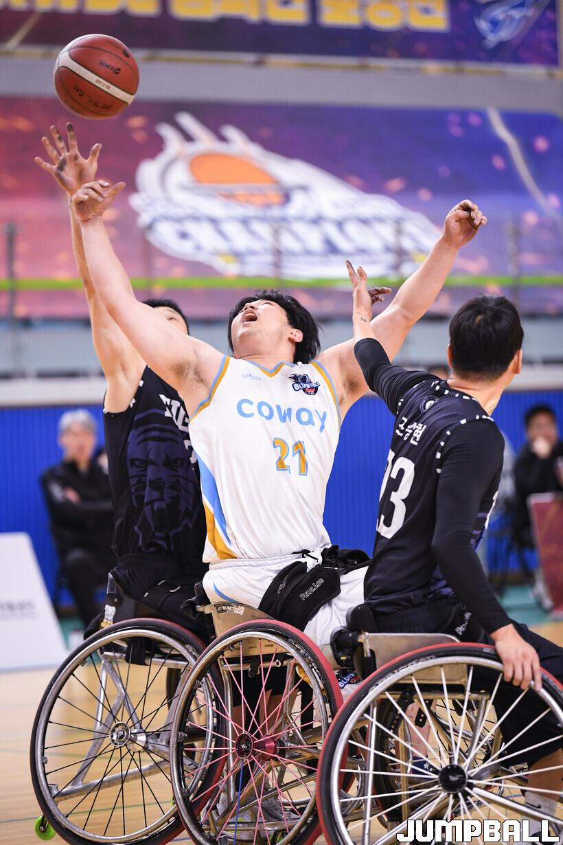 [점프볼=남양주/유용우 기자] 4일 남양주체육문화센터에서 열린 2025 KWBL 휠체어농구리그 코웨이블루휠스와 춘천타이거즈의 챔피언결정전 3차전, 양팀 선수들이 리바운드를 경합하고 있다.
