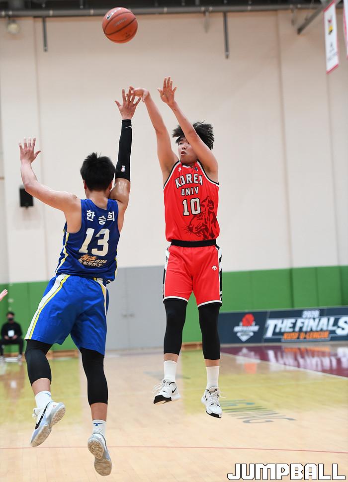[점프볼=이천/문복주기자] 18일 경기도 이천 LG챔피언스파크에서 열린 2020 KUSF 대학농구 U-리그 남대부 결승전으로 고려대와 연세대의 경기, 고려대 박민우가 3점슛을 던지고 있다.