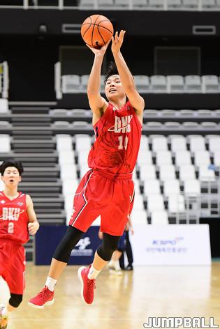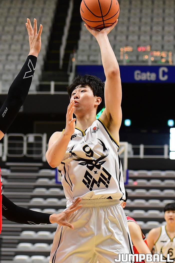 [점프볼=수원/박상혁 기자] 26일 서수원칠보체육관에서 열린 2021 KUSF 대학농구 U리그 고려대와 상명대의 남자부 2일차 경기, 상명대 신규현이 골밑에서 슛을 시도하고 있다.