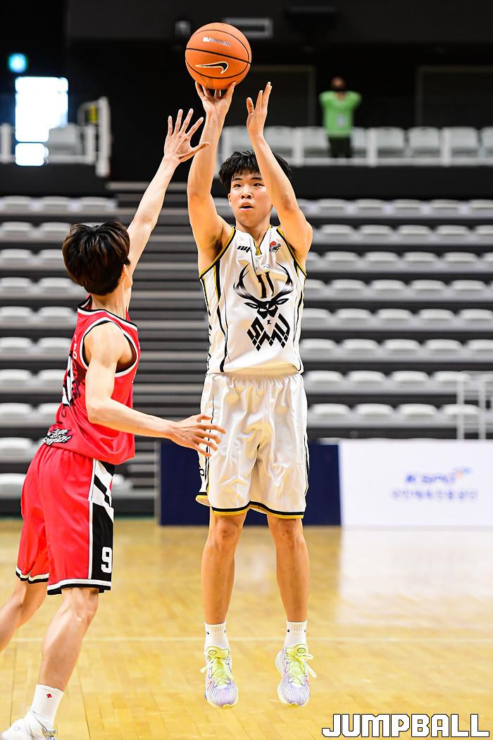 [점프볼=수원/박상혁 기자] 26일 서수원칠보체육관에서 열린 2021 KUSF 대학농구 U리그 고려대와 상명대의 남자부 2일차 경기, 상명대 최진혁이 3점슛을 시도하고 있다.