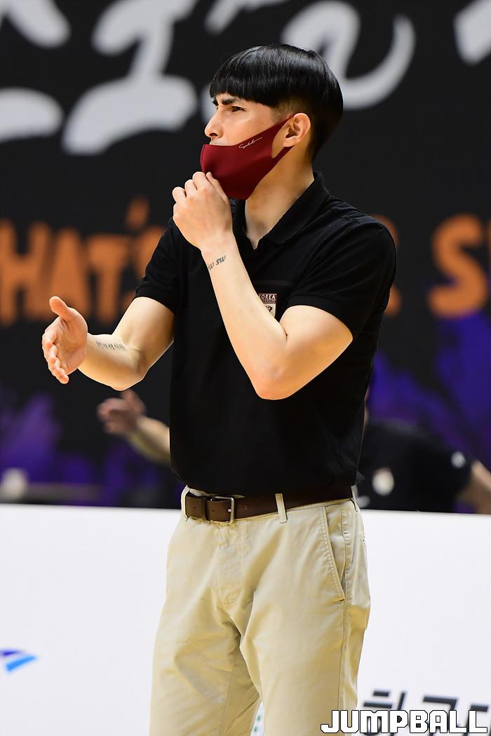 [점프볼=수원/박상혁 기자] 26일 서수원칠보체육관에서 열린 2021 KUSF 대학농구 U리그 고려대와 상명대의 남자부 2일차 경기, 고려대 주희정 감독이 선수들에게 지시를 내리고 있다.