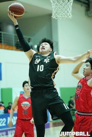 3일 이천에 위치한 LG챔피언스파크에서 열린 2021-2022 KBL D-리그 현대모비스와 상무의 경기, 상무 강상재가 레이업을 올리고 있다.