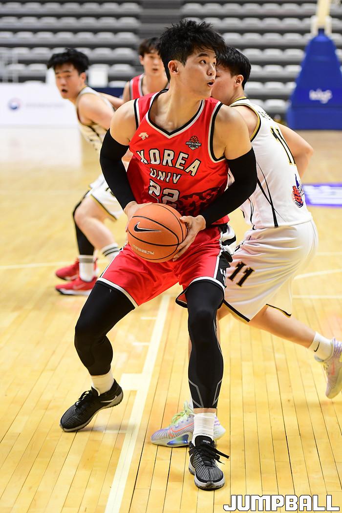 [점프볼=수원/박상혁 기자] 26일 서수원칠보체육관에서 열린 2021 KUSF 대학농구 U리그 고려대와 상명대의 남자부 2일차 경기, 고려대 하윤기가 인사이드에서 공격을 시도하고 있다.