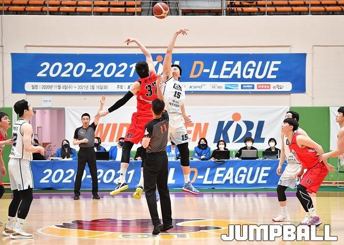 [점프볼=이천/유용우 기자] 9일 이천 LG 챔피언스파크에서 열린 2020-2021 KBL D-리그 2차 대회 현대모비스와 KCC의 경기가 점프볼로 시작되고 있다.