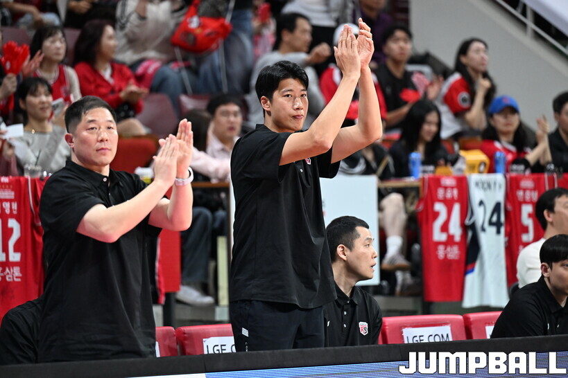 코트에서는 ‘지미타임’이 발동됐다. 1쿼터 초반 김종규와의 2대2를 통해 정관장의 첫 득점에 기여한 박지훈은 이후 돌파, 템포 푸쉬를 통해 꾸준히 득점을 쌓으며 정관장의 완승에 앞장섰다. 박지훈은 국내선수 가운데 최다인 13점에 3리바운드 7어시스트를 곁들이며 ‘전 주장’ 양희종 코치와 하이파이브를 나눴다. 정관장 팬들이 꿈꿔왔던 장면이 현실로 이뤄진 순간이었다.