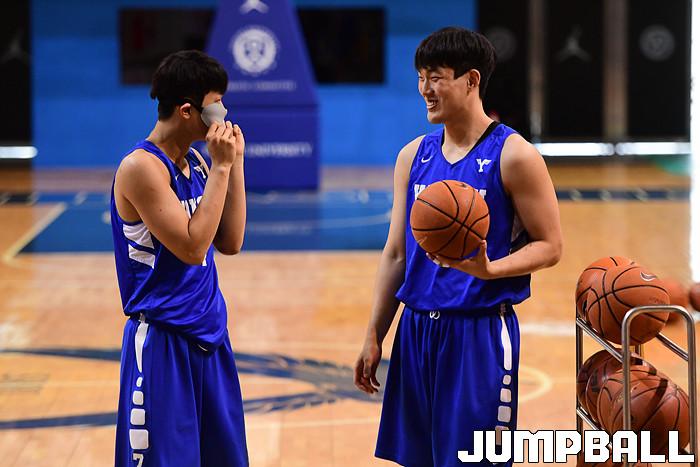 [점프볼=서울/박상혁 기자] 6일 연세대 신촌캠퍼스 체육관에서 대한체육회 주최로 '라이벌 대전' 첫회 녹화가 진행되었다. 연세대는 김택훈이 감독으로 나와 신승민과 양준석, 유기상과 팀을 이루었고, 고려대는 이현호가 감독으로 출전하여 여준형, 최성현, 김태완을 지도했다. 연세대 신승민이 유기상과 대화를 나누고 있다.