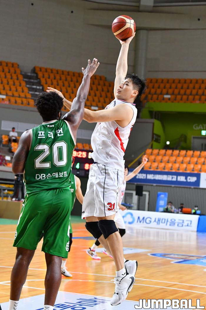 17일 경상북도 상주시 상주실내체육관에서 열린 2021 MG새마을금고 KBL컵 대회 울산 현대모비스와 원주 DB의 4강 경기, 현대모비스 장재석이 훅슛을 던지고 있다.