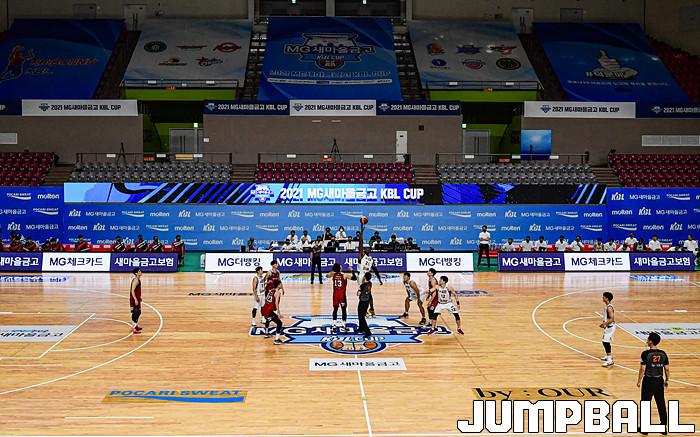 [점프볼=상주/박상혁 기자] 12일 경상북도 상주시 상주실내체육관에서 열린 '2021 MG새마을금고 KBL컵 대회' 부산 KT와 안양 KGC인삼공사의 경기, 점프볼로 경기가 시작되었다.