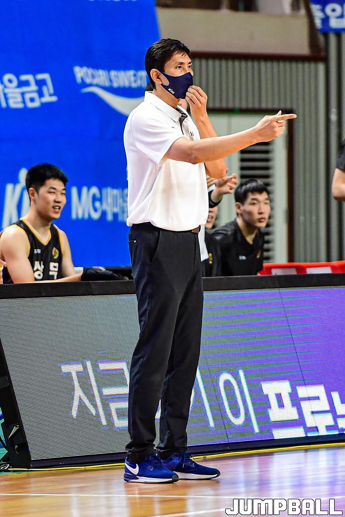 13일 경상북도 상주시 상주실내체육관에서 열린 2021 MG새마을금고 KBL컵 대회 원주 DB와 상무의 경기, 상무 장창곤 감독이 선수들에게 지시를 하고 있다.