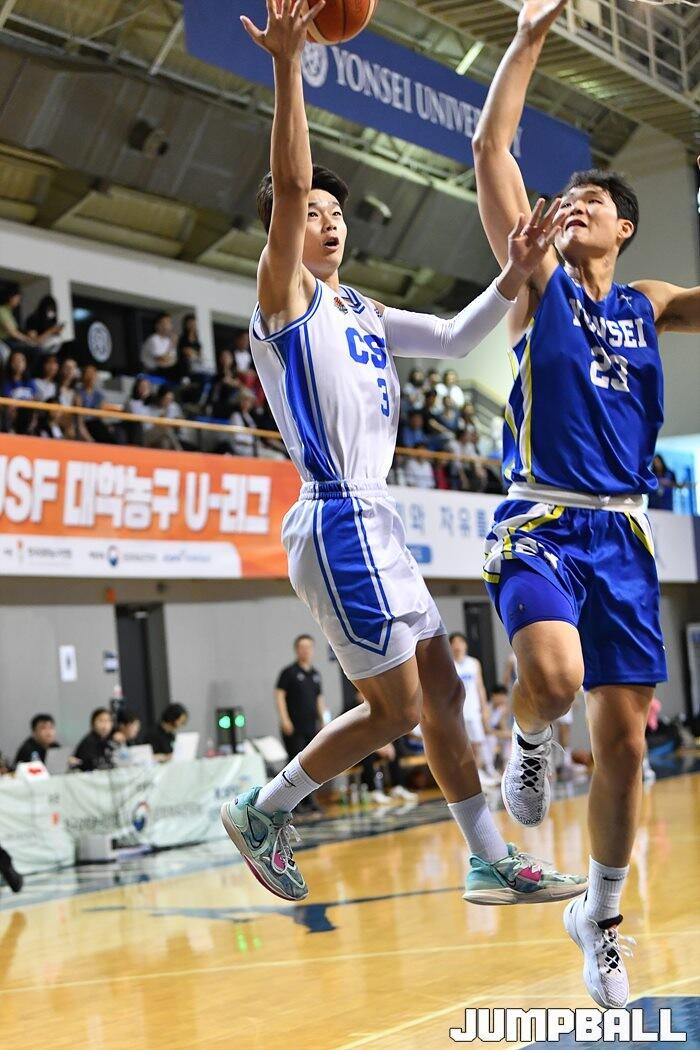9일 연세대학교 신촌캠퍼스체육관에서 열린 2023 KUSF 대학농구 U-리그 연세대와 조선대의 경기, 조선대 홍영규가 레이업을 올리고 있다. [점프볼=신촌/유용우 기자]