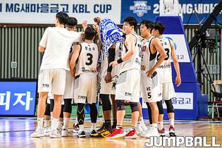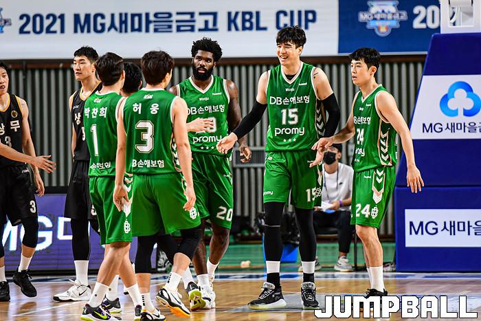 13일 경상북도 상주시 상주실내체육관에서 열린 2021 MG새마을금고 KBL컵 대회 원주 DB와 상무의 경기, DB 선수단이 환호하고 있다.