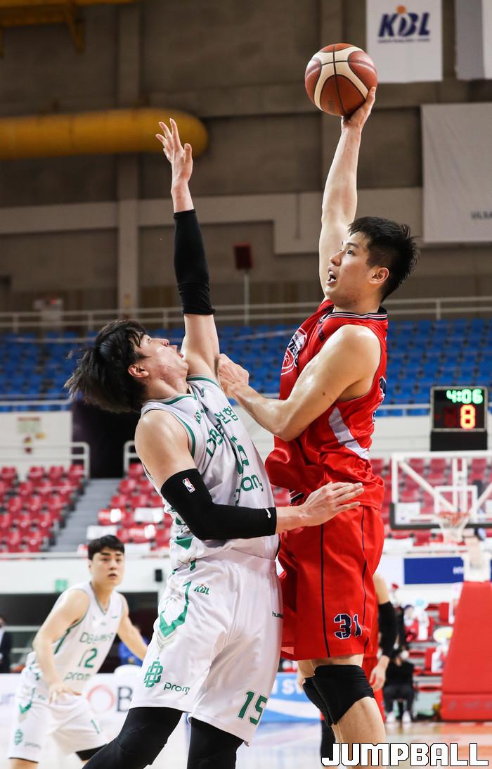 [점프볼=윤민호 기자]6일 울산 동천체육관에서 열린 2020-2021 현대모비스 프로농구 울산 현대모비스와 원주 DB의 경기에서 현대모비스 장재석이 DB 김종규의 수비를 피해 슛을 하고 있다.