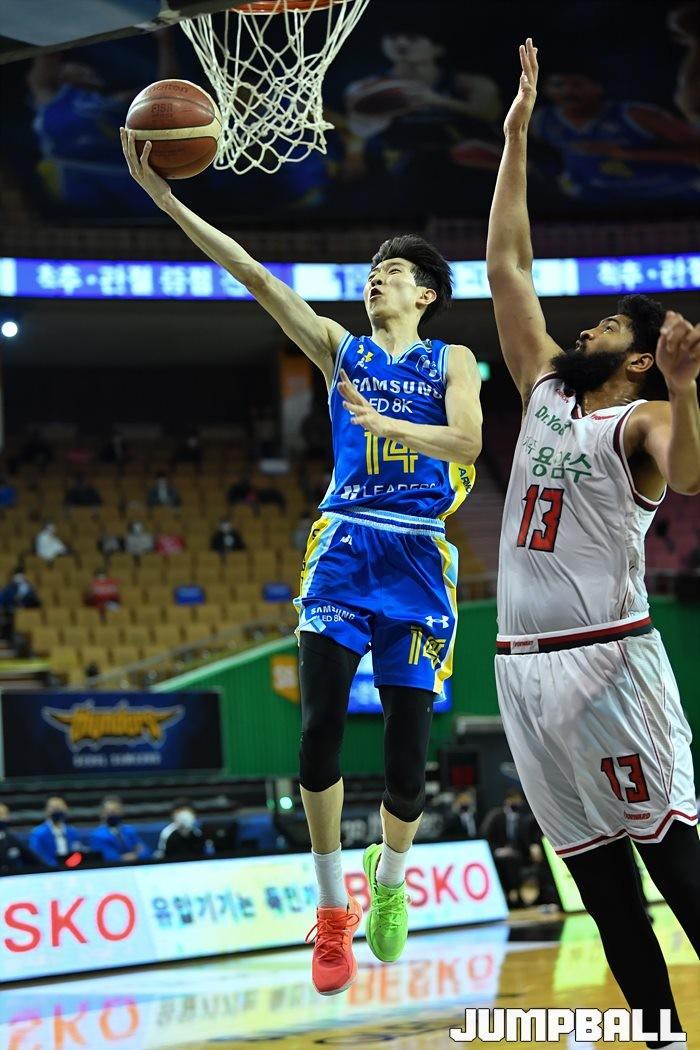 [점프볼=잠실/유용우 기자] 28일 잠실실내체육관에서 열린 2020-2021 현대모비스 프로농구 서울 삼성과 고양 오리온의 경기, 삼성 김진영이 레이업 득점을 올리고 있다.