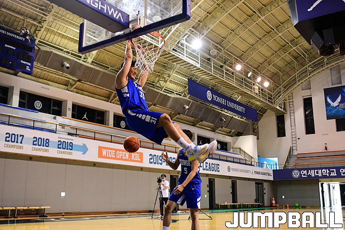 [점프볼=서울/박상혁 기자] 6일 연세대 신촌캠퍼스 체육관에서 대한체육회 주최로 '라이벌 대전' 첫회 녹화가 진행되었다. 연세대는 김택훈이 감독으로 나와 신승민과 양준석, 유기상과 팀을 이루었고, 고려대는 이현호가 감독으로 출전하여 여준형, 최성현, 김태완을 지도했다. 덩크슛 대결에서 연세대 신승민이 양준석의 패스를 받아 덩크슛을 성공시키고 있다.