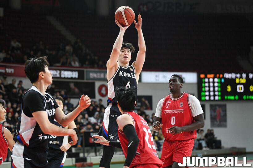 [점프볼=안양/유용우 기자] 25일 안양 정관장 아레나에서 열린 2027 FIBA(국제농구연맹) 농구 월드컵 아시아 예선에 출전하는 남자농구대표팀과 정관장의 연습경기, 대표팀 이정현이 수비 사이로 공격을 시도하고 있다.