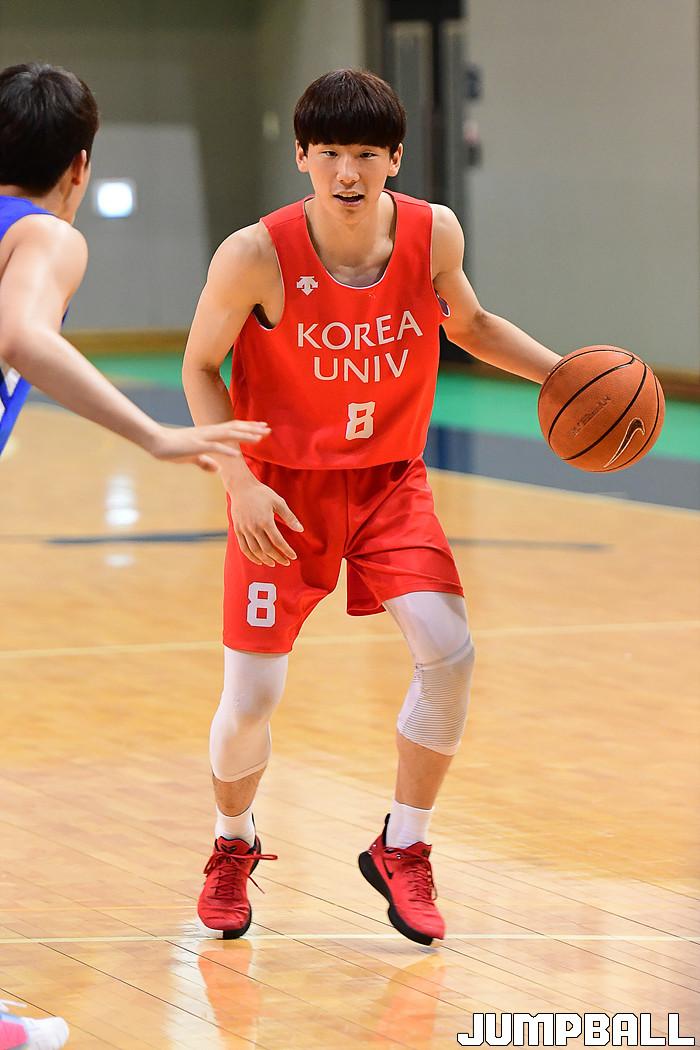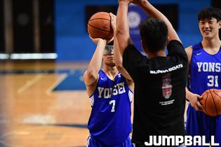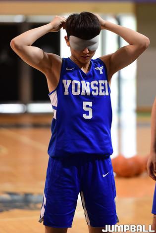 [점프볼=서울/박상혁 기자] 6일 연세대 신촌캠퍼스 체육관에서 대한체육회 주최로 '라이벌 대전' 첫회 녹화가 진행되었다. 연세대는 김택훈이 감독으로 나와 신승민과 양준석, 유기상과 팀을 이루었고, 고려대는 이현호가 감독으로 출전하여 여준형, 최성현, 김태완을 지도했다. 라이벌 대전 마지막 승부인 1대 1 대결에서 고려대 김태완이 공격을 시도하고 있다.