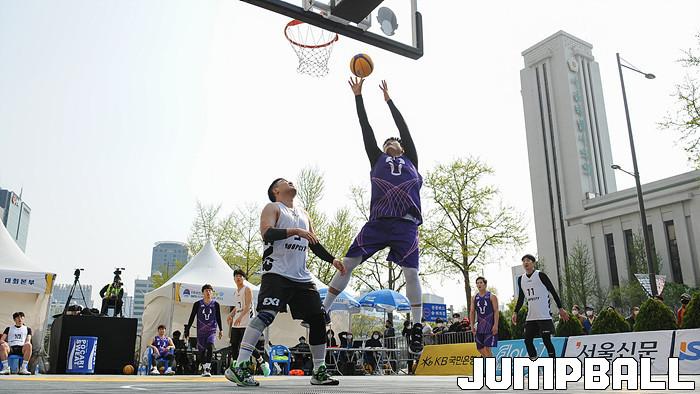 [점프볼=서울/박상혁 기자] 10일 서울신문사앞 특설코트에서 열린 KB국민은행 LIIV m 3X3 코리아투어 2021 서울 대회, 오픈부 아잇패밀리가 골밑에서 슛을 시도하고 있다.