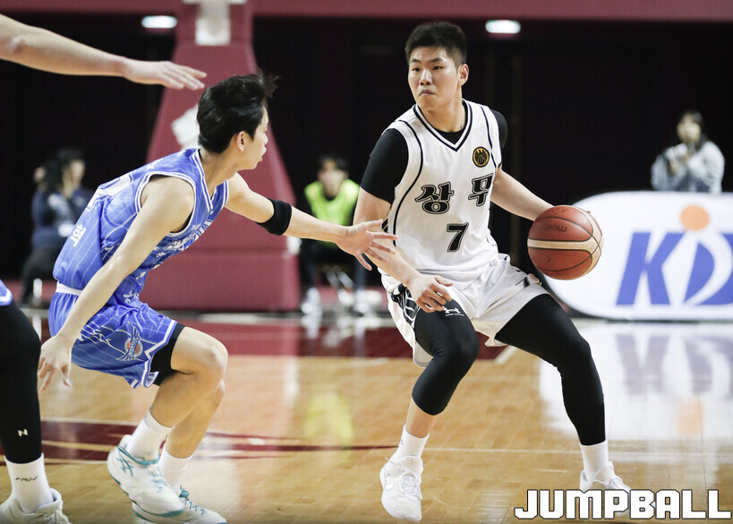 [점프볼=용인/양윤서 인터넷기자] 10일 경희대학교 국제캠퍼스 선승관에서 열린 2025-2026 KBL D리그 대구 한국가스공사와 상무의 경기, 상무 안세영이 경기를 조율하고 있다.